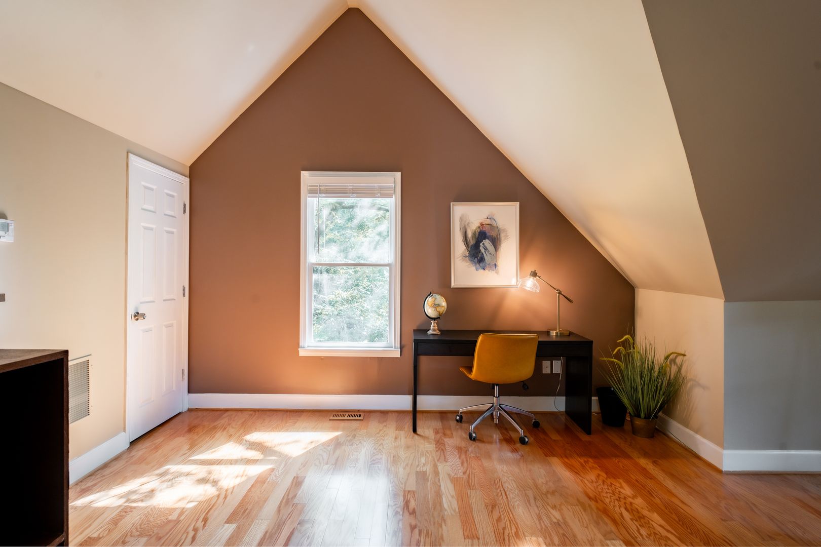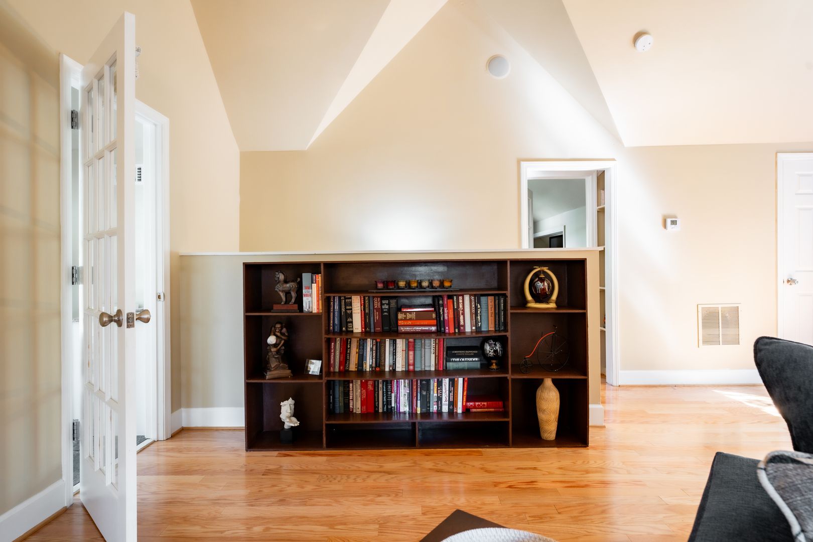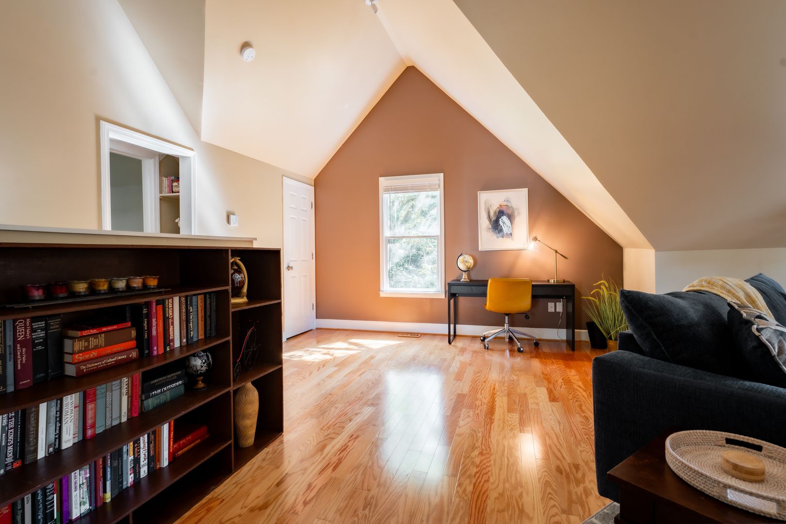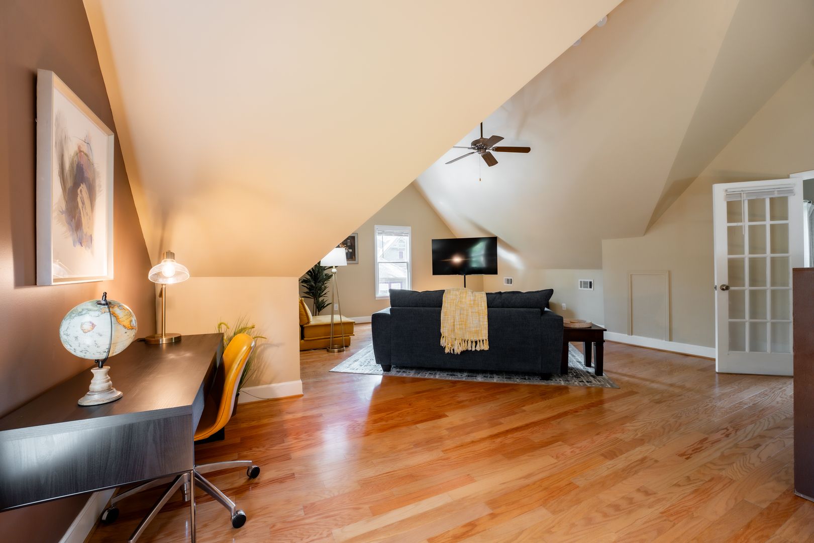 This well-designed two-level home offers a functional layout with a clear separation between living and private spaces, along with the convenience of a 2-car garage equipped with an electric vehicle charging station. The main level includes an eat-in kitchen, half bathroom, and laundry area, providing easy day-to-day living and direct access to the garage. Upstairs, the home opens into a bright and spacious great room with vaulted ceilings and abundant natural light. This level also features a dedicated desk/work area, a private bedroom, and a full bathroom, creating a comfortable and flexible living environment. With hardwood floors throughout and a layout that supports both living and working from home, this property offers a practical and comfortable space in a convenient location close to shopping, dining, and major routes.