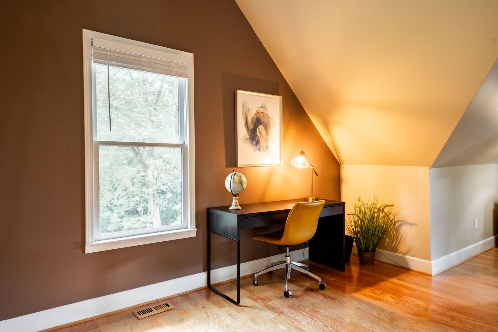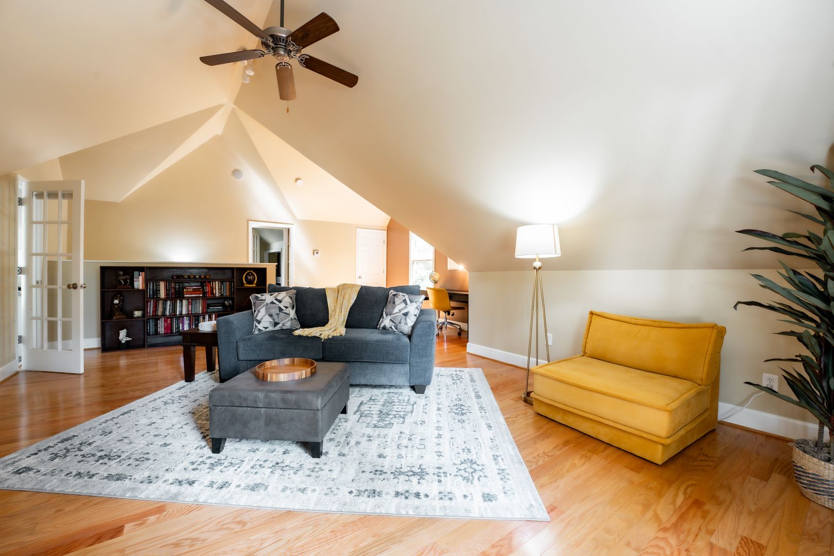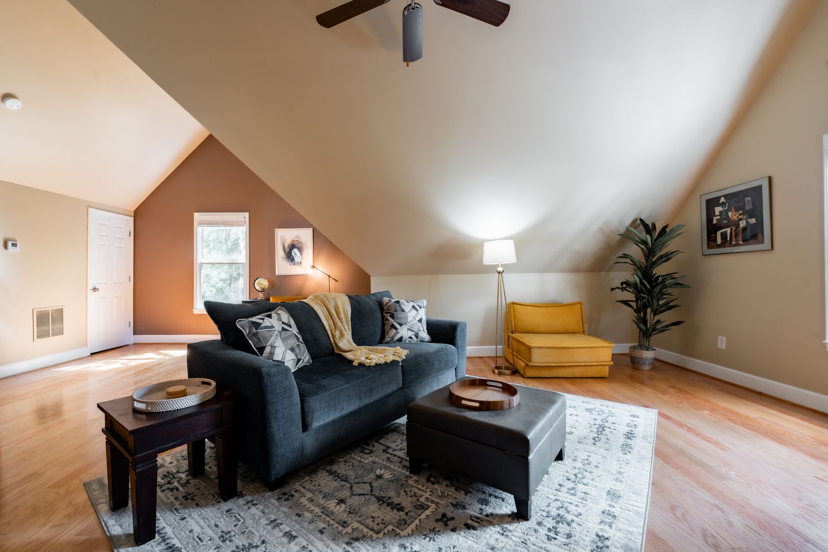 This well-designed two-level home offers a functional layout with a clear separation between living and private spaces, along with the convenience of a 2-car garage equipped with an electric vehicle charging station. The main level includes an eat-in kitchen, half bathroom, and laundry area, providing easy day-to-day living and direct access to the garage. Upstairs, the home opens into a bright and spacious great room with vaulted ceilings and abundant natural light. This level also features a dedicated desk/work area, a private bedroom, and a full bathroom, creating a comfortable and flexible living environment. With hardwood floors throughout and a layout that supports both living and working from home, this property offers a practical and comfortable space in a convenient location close to shopping, dining, and major routes.